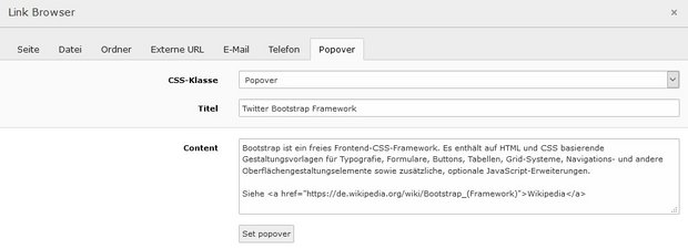 Popovers werden vom Bootstrap-Framework bereit gestellt. Sie erlauben die Anzeige von Zusatzinformationen in einem Fenster. Popovers können mit Hilfe des Link-Browsers über das Register Popover einfach definiert werden.